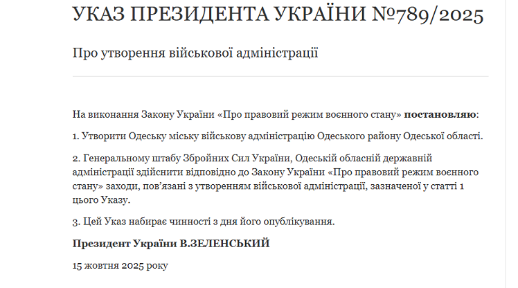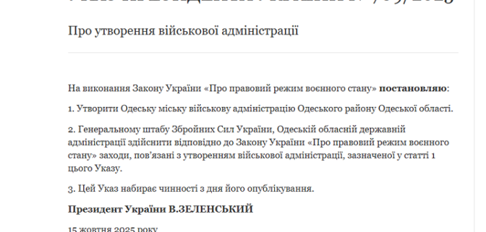 Офіційний указ про утворення Одеської міської військової адміністрації опубліковано сьогодні. Він набуває чинності з дати опублікування. Відповідним розпорядженням начальником ОМВА Одеського району Одеської області призначено Сергія Лисака.