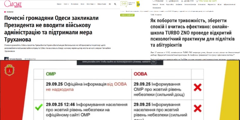 До контрагітації також можна віднести повідомлення «Труханов звинувачує ОДА у відсутності координації під час повені». Тут є відповідні ознаки, оскільки основний акцент робиться на тому, що міська влада нібито діяла самостійно та ефективно під час нещодавньої повені в Одесі, коли за один вечір загинуло десять осіб, тоді як обласна адміністрація подається як пасивна й безініціативна. Тож, такий підхід формує позитивний імідж міського голови та перекладає відповідальність за кризу на обласну владу. Матеріал використовує пряму мову мера та його заступника без балансу думок — у тексті відсутня позиція Одеської ОВА чи ДСНС, що робить новину однобічною та створює враження керованого інформаційного меседжу. Візуальні й емоційні елементи, такі як згадка про «зелені галочки» міськради та «червоні хрестики» військової адміністрації, підсилюють контраст між «ефективною» міською владою і «бездіяльною» ОВА, підкріплюючи образ мера як єдиного дієвого керівника під час кризи, що є характерною ознакою контрагітаційного матеріалу.
