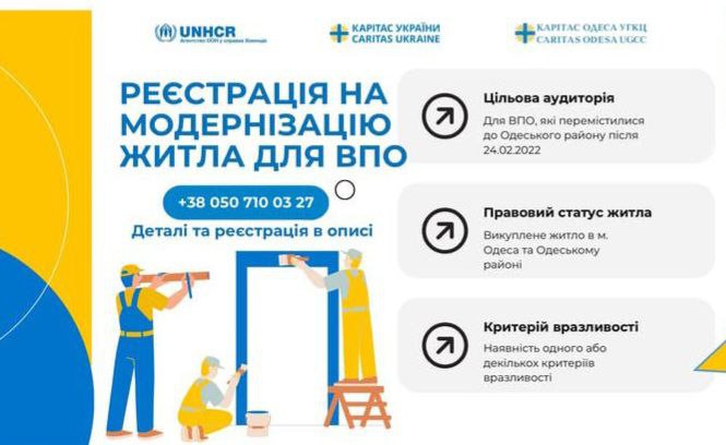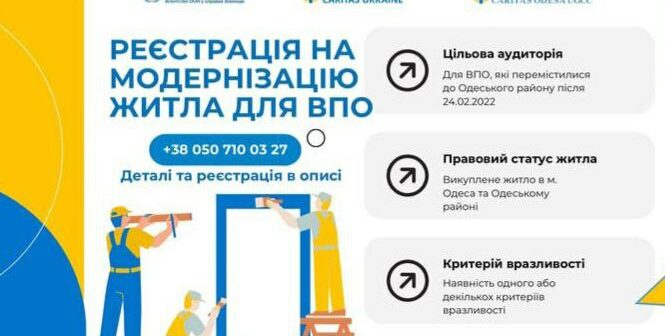 Допомогу можуть отримати люди, які мають статус ВПО, переїхали в Одесу або Одеський район з зон бойових дій або тимчасово окупованих територій та мають один з критеріїв вразливості:- особа з важким захворюванням;- особа з інвалідністю;- самотня особа віком 60+;- одинокий батько/мати або опікун неповнолітніх дітей;- багатодітна родина (3 і більше неповнолітніх дітей);- родина з усиновленою дитиною;- родина, яка виховує дітей під опікою;- вагітна жінка або мати з дітьми до 3-х років;- домогосподарство, яке втратило джерело доходу або має середньомісячний дохід наодну особу менше ніж 8422 грн.Пріоритет у наданні підтримки надається родинам, які придбали житло в Одесі або Одеському районі та мають найбільшу потребу.Під час відбору враховується:- склад родини;- правовий статус житла;- відсутність можливості самостійно провести необхідні роботи;- відсутність отриманої раніше аналогічної допомоги.Працюємо у взаємодії з громадами, місцевою владою та державними програмами, щобжитлові рішення були системними, взаємодоповнюваними та довготривалими.Для консультації звертайтеся за телефоном: 0507100327 (ПН-ПТ 10:00 – 16:00)Реєстрація за посиланням: https://forms.gle/GzWL6bqCVPgiLEo58Допомога надається за підтримки UNHCR Ukraine – Aгентство ООН у справах біженців в Україні у співпраці з Caritas Ukraine.