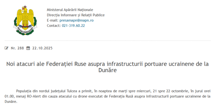 Як повідомило Міністерство національної оборони Румунії, в ніч із вівторка на середу, 21-22 жовтня, близько 01:00 надійшло повідомлення RO-Alert у зв’язку з атакою безпілотників, здійсненої Російською Федерацією на українську портову інфраструктуру на Дунаї.