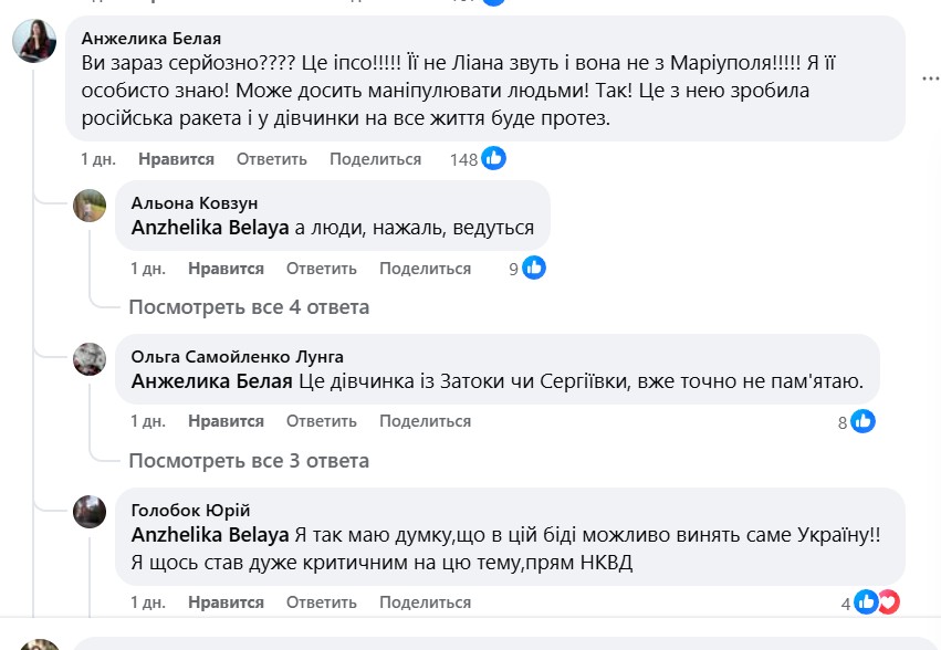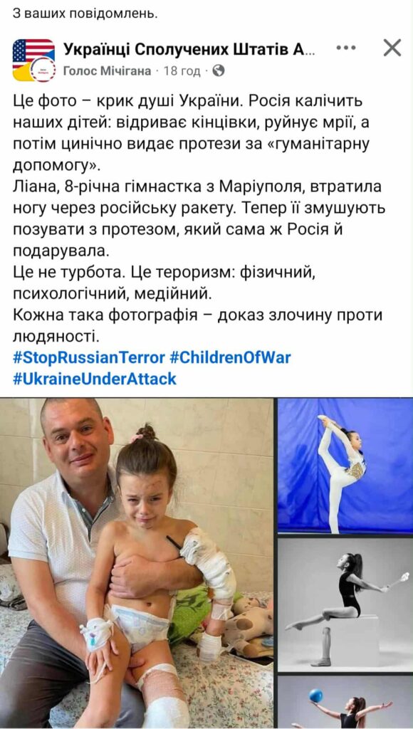 Днями у групі “Українці Сполучених Штатів Америки” з’явився допис про Ліану, 8-річну гімнастку з Маріуполя, яка втратила ногу через російську ракету. У дописі стверджується, що її змушують позувати з протезом, який сама ж Росія й подарувала. Однак публікація проілюстрована фотографіями Олександри Паскаль з Одещини, яка нині мешкає в Україні.