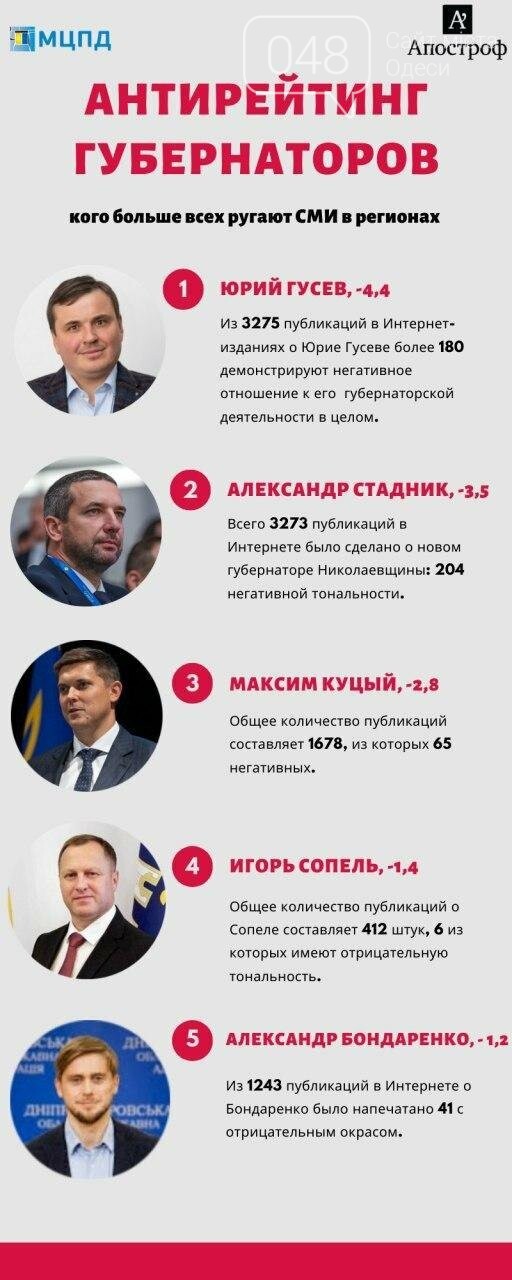 Подавляющее большинство глав ОГА, включенных в “Рейтинг”, имеют серьезные проблемы с коммуникацией. Часто их действия просто не находят понимания в местных СМИ. А иногда пресса их в буквальном смысле “медийно уничтожает”. В результате в Индексе медиа-восприятия они получают не просто низкие положительные, но отрицательные баллы (сам Индекс рассчитывается как среднее значение разницы между процентом положительных и негативных публикаций в местных СМИ о персоне главы ОГА, – ред.). ТОП-5 таких губернаторов объединили в своеобразный антирейтинг.