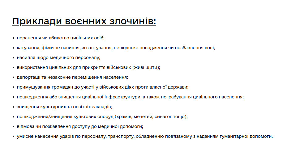 Та повернемося до проблеми документування. Як засвідчили в Офісі Генпрокурора України на зустрічі з міжнародними партнерами, вже зафіксовано понад 170 тисяч воєнних злочинів, вчинених представниками держави-агресора. Цей перелік постійно поповнюється, зокрема з цією метою створено сайт warcrimes.gov.ua.