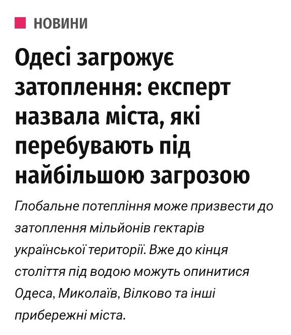 Публікація «Одесі загрожує затоплення: експерт назвала міста, які перебувають під найбільшою загрозою» подає прогнозування наслідків кліматичних змін, спираючись на дані Greenpeace та «Екодії». Матеріал містить конкретні цифри, назви населених пунктів та відсоток потенційного підтоплення. Проте подача створює емоційний ефект нагальності, хоча йдеться про можливий розвиток подій через десятиліття. Формулювання на кшталт «може опинитися під водою» без часової прив’язки підсилює страх і знижує критичне сприйняття. Це типовий прийом медіа, коли наукові сценарії майбутнього подаються як сучасна загроза.