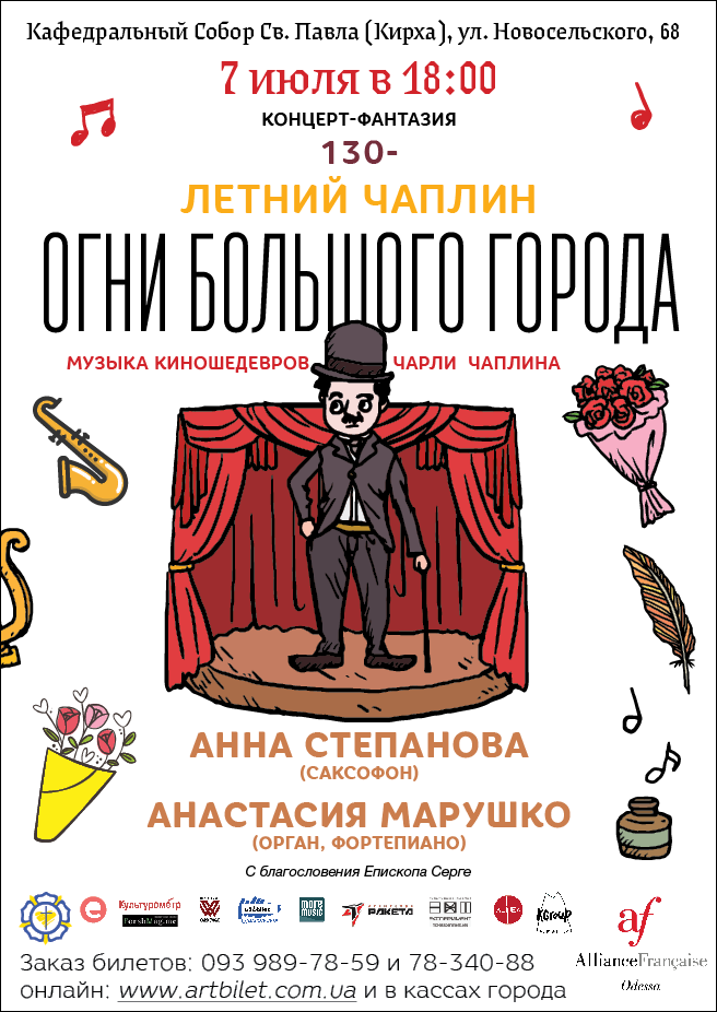 Впервые в Одесской Кирхе прозвучат шедевры немого кино Чаплина. Завтра, 7 июля, завтра состоится концерт-фантазия – звучит музыка киношедевров Чарли Чаплина, исполненная на органе и саксофоне. Начало в 18.00.