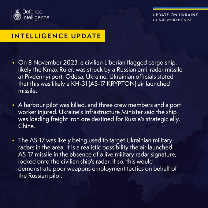 Зазначається, що 8 листопада 2023 року цивільне вантажне судно під прапором Ліберії, ймовірно Kmax Ruler, було вражене російською протирадіолокаційною ракетою в порту Південний, Одещина, Україна. Українські офіційні особи заявили, що це, ймовірно, ракета повітряного базування Х-31 (за класифікацією НАТО — AS-17 Krypton).