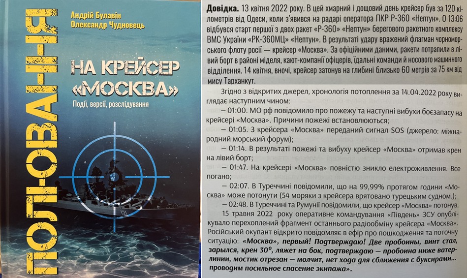 «Міноборони Російської Федерації не визнало, не визнає́ і, скоріш за все, вже ніколи не ви́знає, що ракетний крейсер «Москва» був знищений нашими ракетами «Нептун». Тому вони намагаються будь-якими шляхами приховати правду і досить велику кількість версій, починаючи одразу після потоплення «Москви», почали обговорювати в пресі. Ми всі ці основні версії розібрали в книзі. Для прикладу, вони говорили про міни, про диверсантів, про аварії від пожежі в котельному відділенні. Також говорили, що це були ракети ЗРК «Форд», що по крейсеру били війська НАТО з Румунії», – говорить один з авторів книги, дослідник військової історії член ради громадської організації «Київське військово-історичне товариство» Андрій Булавін.