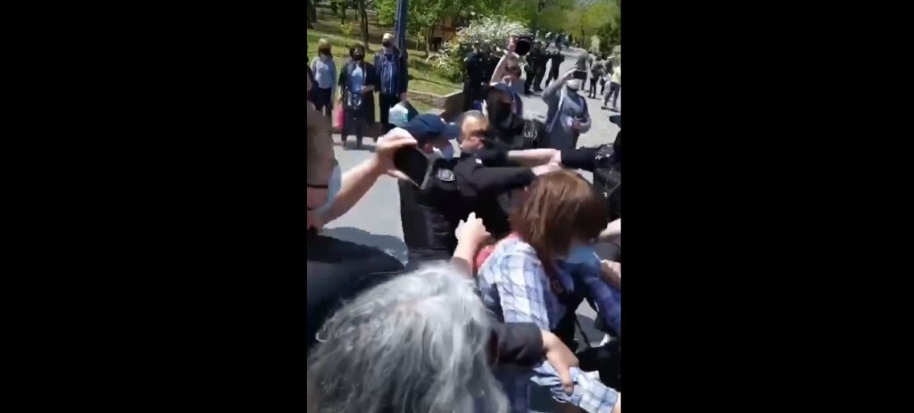 Балаба попыталась снять запрещенную георгиевскую ленточку у одной из участниц массового мероприятия, но участники набросились на нее толпой, ударили по голове и тягали за волосы.