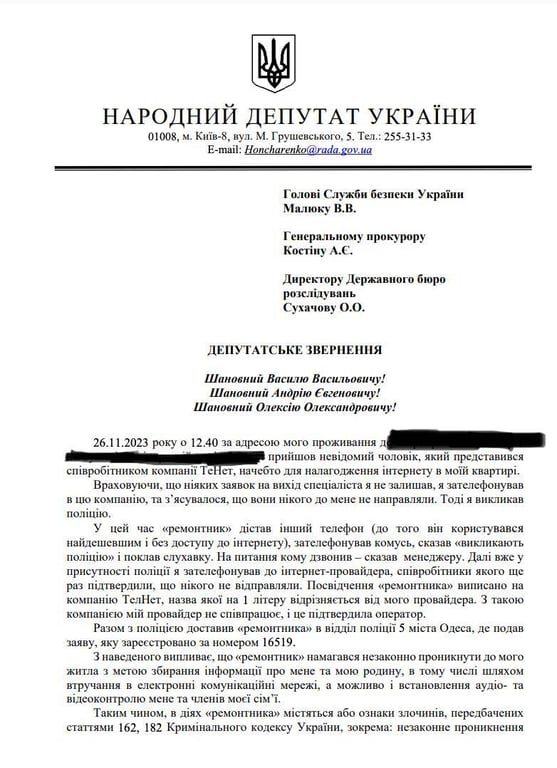 Гончаренко розповів, що співробітник СБУ прийшов до нього під виглядом співробітника інтернет-провайдера, аби полагодити інтернет, що зламався. Проте коли нардеп зателефонував до компанії, виявилося, що вони нікого не відправляли, тож він викликав поліцію.