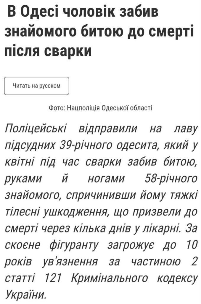 Наступна публікація «В Одесі чоловік забив знайомого битою до смерті після сварки» повідомляє про вбивство під час сварки й переважно переповідає поліційний реліз: використовуються драматичні деталі (бита, рукоприкладство, смерть) без ширшого контексту про хід слідства, мотиви або позицію підозрюваного; це посилює емоційну реакцію читача і створює враження «сенсації», тоді як основні факти (затримання, висунення обвинувачення) походять із пресслужби поліції й не підкріплені додатковими джерелами є класичним прикладои подачі пресрелізу як самостійного розслідування.