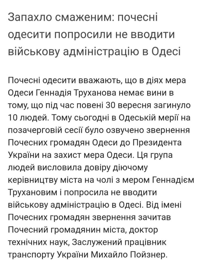 П’ятий матеріал «Запахло смаженим: почесні одесити попросили не вводити військову адміністрацію в Одесі» використовує сатиричні або емоційно забарвлені фрази («запахло смаженим») і збирає «почесних одеситів» як доказ громадської підтримки; тут маніпуляція відбувається через селекцію джерел та образів: кілька виступів підтягуються до загальної тези, ніби весь міський електорат проти військової адміністрації. Насправді публікації такого типу часто є реплікою піар-кампаній або ініціатив окремих груп. Читачам важливо розрізняти репрезентативні опитування/рішення і вибіркові заяви.