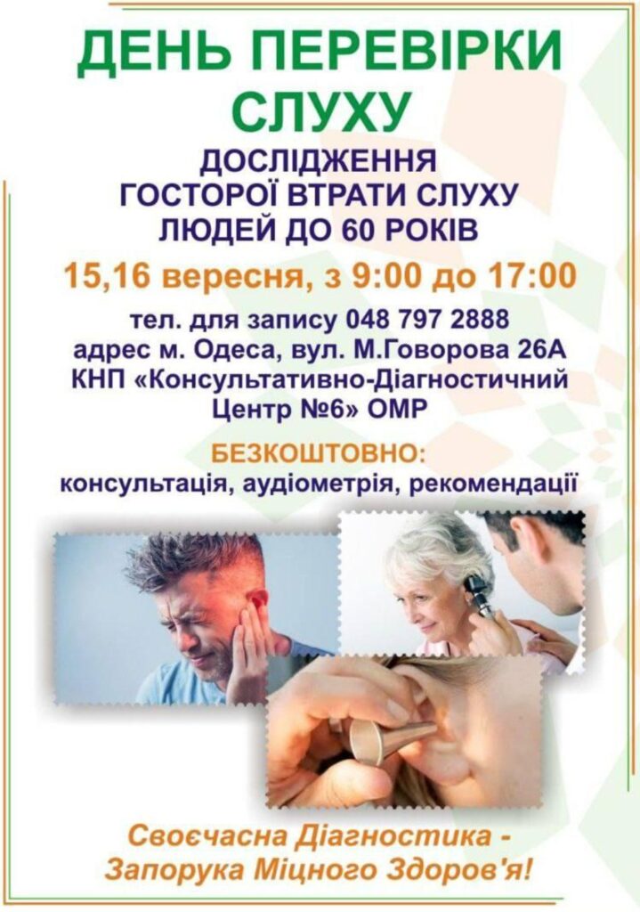 15 та 16 вересня з 9:00 до 17:00 в поліклініці №6 проведуть Дні перевірки слуху — дослідження втрати слуху для людей віком до 60 років.
