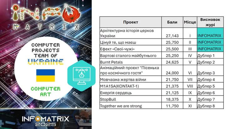 За підсумками роботи журі суперфіналу, право представляти Україну на світовому фіналі Міжнародного конкурсу комп’ютерних проєктів INFOMATRIX-2025 здобули: