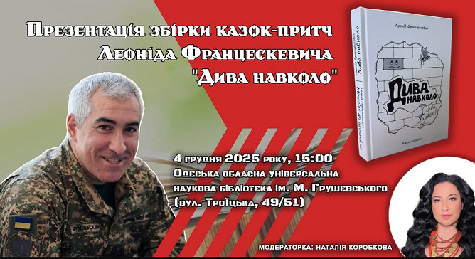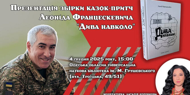 Леонід Францескевич, одеський журналіст, редактор, коментатор, фотограф, а з 2024 року – військовослужбевць 11 бригади імені М. Грушевського Національної гвардії України презентує в бібілотеці імені М. Грушевського свою дебютну збірку казок «Дива навколо».