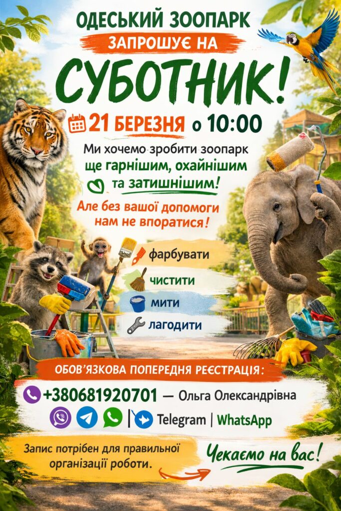 21 березня о 10:00 Одеський зоопарк відкриває час добрих справ.Ми хочемо зробити зоопарк ще гарнішим, охайнішим та затишнішим. Але без вашої допомоги нам не впоратися, – пише директор зоопарку Ігор Бєляков. Будемо: фарбувати, чистити, мити, лагодити. Запрошуємо всіх небайдужих долучитися! Разом ми створимо простір, у який буде приємно приходити і дітям, і дорослим.