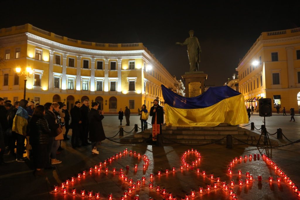 В честь погибших героев активисты развернули на постаменте памятника Дюку де Ришелье государственный флаг Украины и возложили на него красные розы, а до этого перед Дюком выложили большой тризуб из красных лампад.
