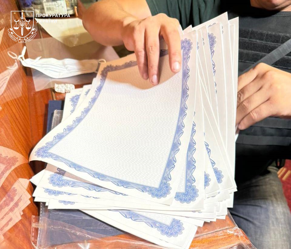За результатами проведених обшуків правоохоронці вилучили комп’ютерну техніку, заготовки документів, голограми, фотознімки, бланки посвідчень, ламінувальні матеріали, чорнові записи та грошові кошти.
