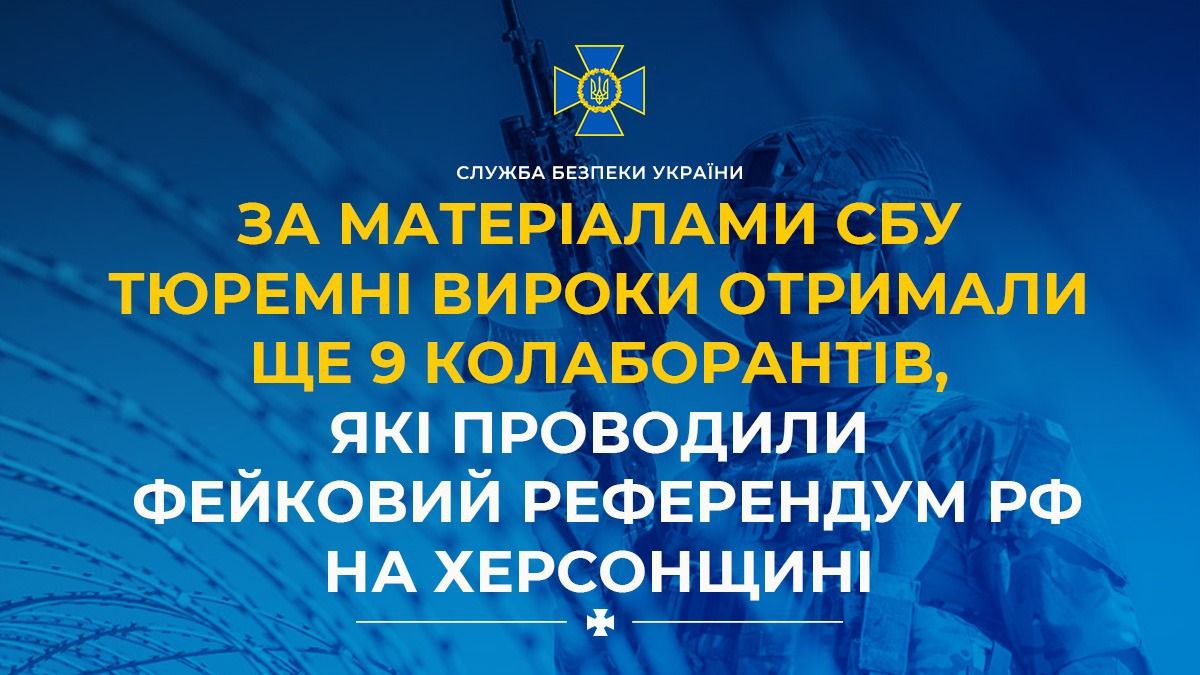За доказовою базою Служби безпеки до 10 років ув’язнення з конфіскацією майна отримали ще дев’ять колаборантів, які організовували псевдореферендум рф під час окупації Херсона. Вісім з них отримали реальні терміни покарання, ще одна зловмисниця – засуджена заочно, оскільки переховується від правосуддя на лівобережжі південного регіону.
