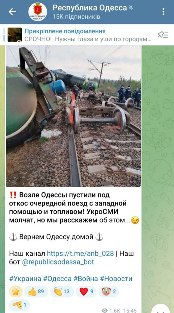 Минулого тижня в російських телеграм-каналах отримав поширення фейк про те, що на Одещині спустили під уткіс потяг, який віз західну допомогу. Таку неправдиву інформацію інформацію ми помітили, моніторячи проросійські телеграм-канали. Автори фейку стверджували, що на фото підірваний потяг, який віз до України «західну допомогу», і що українська робила все можливе, щоб приховати цей факт від української громадськості.