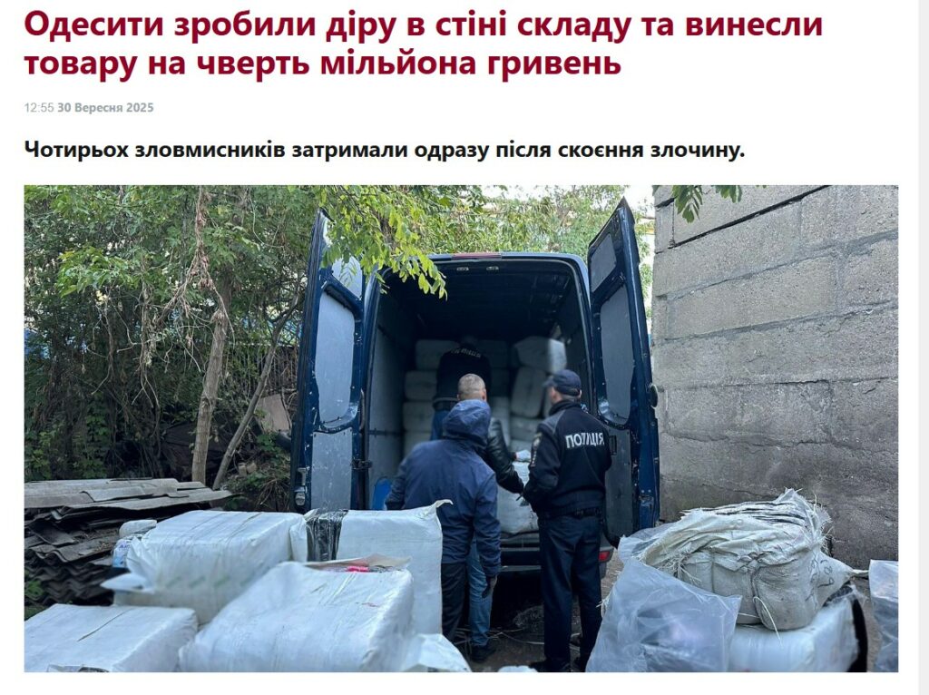 Публікація «Одесити зробили діру в стіні складу та винесли товару на чверть мільйона гривень» подається як оперативна кримінальна новина з конкретними деталями і посиланнями на пресслужбу поліції, проте заголовок й окремі фрази підсилюють драматичність, що робить матеріал емоційно навантаженим і підвищує клікабельність. При цьому відсутні коментарі потерпілої сторони або результати експертизи, тому читач не знайомий з деталями, йому пропонується погодитись з авторськими висновками.