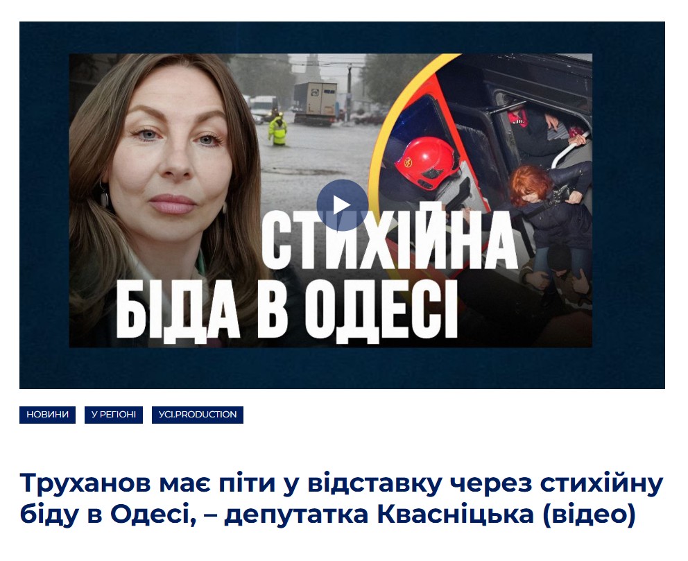 Публікація «Труханов має піти у відставку через стихійну біду в Одесі, – депутатка Квасніцька » має ознаки політичної маніпуляції. З одного боку, у заголовку виноситься, що ці слова особиста думка однією з депутаток Одеської міської ради. Це була її реакція на трагічну повінь, яка забрала життя дев’ятьох людей в Одесі. З іншого боку, для того щоб стверджувати, хто саме винуватий в трагедії, що сталася, потрібні результати розслідування, які мають встановити всіх, хто не виконав свої зобов’язання, зокрема представників міської влади. Однак поки результати розслідування не опублкіковані, будь-які заяви щодо провини будь-якого посадовця можуть містити зовсім іншу мотивацію, ніж встановлення справедливості.