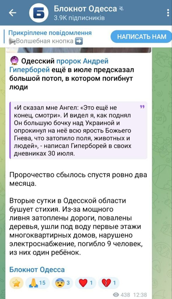 Також проросійські пабліки намагались пов’язати трагічну повінь Одесі з так званим «пророцтвом» одеського містика Андрія Гіперборея. Мовляв, чоловік в липні він нібито записав у щоденнику видіння про «велику бочку Божого гніву», яка затопить землю, тварин і людей. А тепер, після руйнівних злив і загибелі дев’яти людей, цитата подавалась як доказ того, що пророцтво здійснилося. Такий підхід є маніпулятивним і має на меті не пояснити події, а викликати у людей страх і відчуття приреченості.