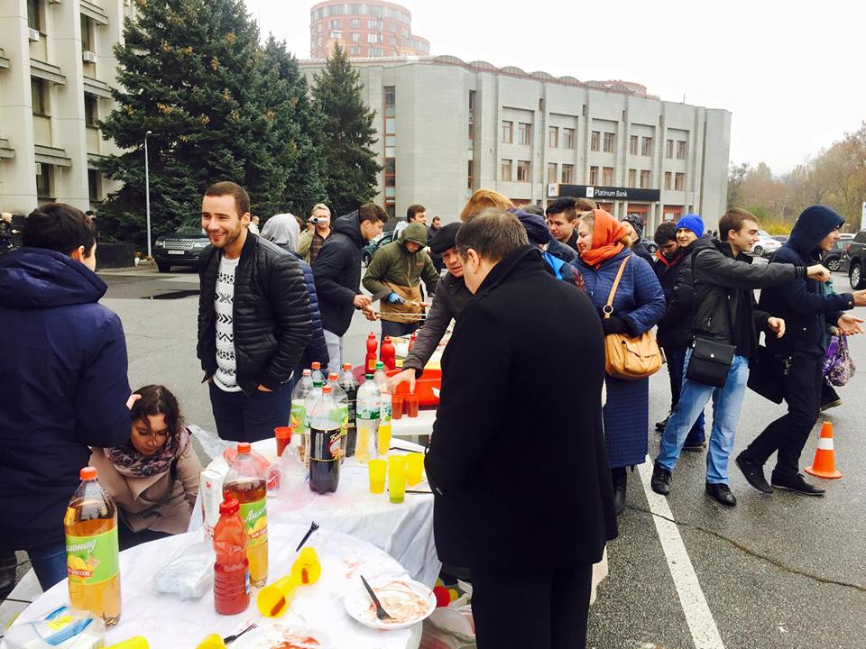 Под стенами Одесской ОГА противники губернатора Одесской области Михеила Саакашвили устроили акцию по раздаче бесплатной еды и напитков в честь его отставки. Параллельно проходит сбор подписей.