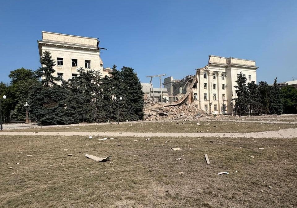 Внаслідок удару утворилася вирва до першого поверху. Нагадаємо, сьогодні зранку російські війська обстріляли центр Херсона керованими авіабомбами та дронами. Загинув один чоловік, ще троє людей отримали поранення. Серед пошкоджених об’єктів — житлові будинки, адмінбудівлі та автомобілі.