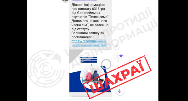 У мережі поширюються повідомлення про нібито грошову допомогу «Тепла зима» від європейських партнерів — по 6 318 грн на кожного члена сім’ї. Для оформлення пропонують перейти за посиланням та залишити заявку.