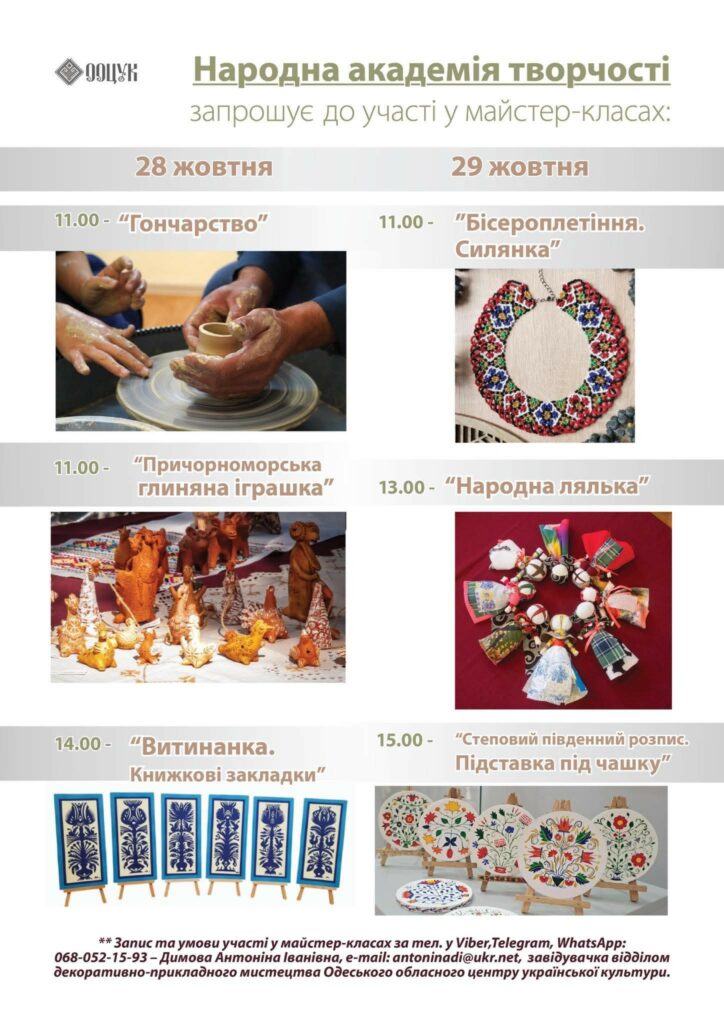 Запис та умови участі у майстер-класах за тел. у Viber,Telegram, WhatsApp: 068-052-15-93 – Димова Антоніна Іванівна, e-mail: [email protected], завідувачка відділом декоративно-прикладного мистецтва Одеського обласного центру української культури.