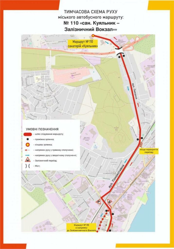 У зв’язку з тимчасовою забороною руху транспортних засобів через залізничний переїзд на перегоні «Одеса – Сортувальна-Одеса-Пересип», який розташований за адресою: м. Одеса вул. Лиманна, 26/1, з 27 травня до 5 червня  2025 року (або до завершення робіт) вносяться зміни тимчасового характеру до схеми руху міського автобусного маршруту № 110:
