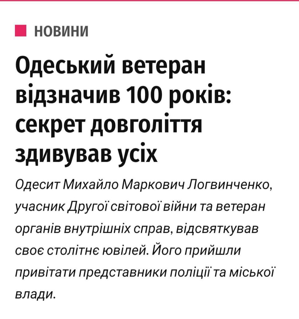 У публікації «Одеський ветеран відзначив 100 років: секрет довголіття здивував усіх» розповідається позитивна історія про столітнього ветерана Михайла Логвинченка, ветерана Другої світової та колишнього правоохоронця, якого вітали представники поліції та місцевої влади. В самому тексті маніпуляції немає однак заголовок зі словами «секрет довголіття здивував всіх» є клікабельним та змушує перейти за посиланням і прочитати новину. Сам текст радше має ознаки нарису з життя, ніж аналітичного матеріалу, і якщо читач прагне фактів про здоров’я чи демографію довгожителів, він їх там не знайде.