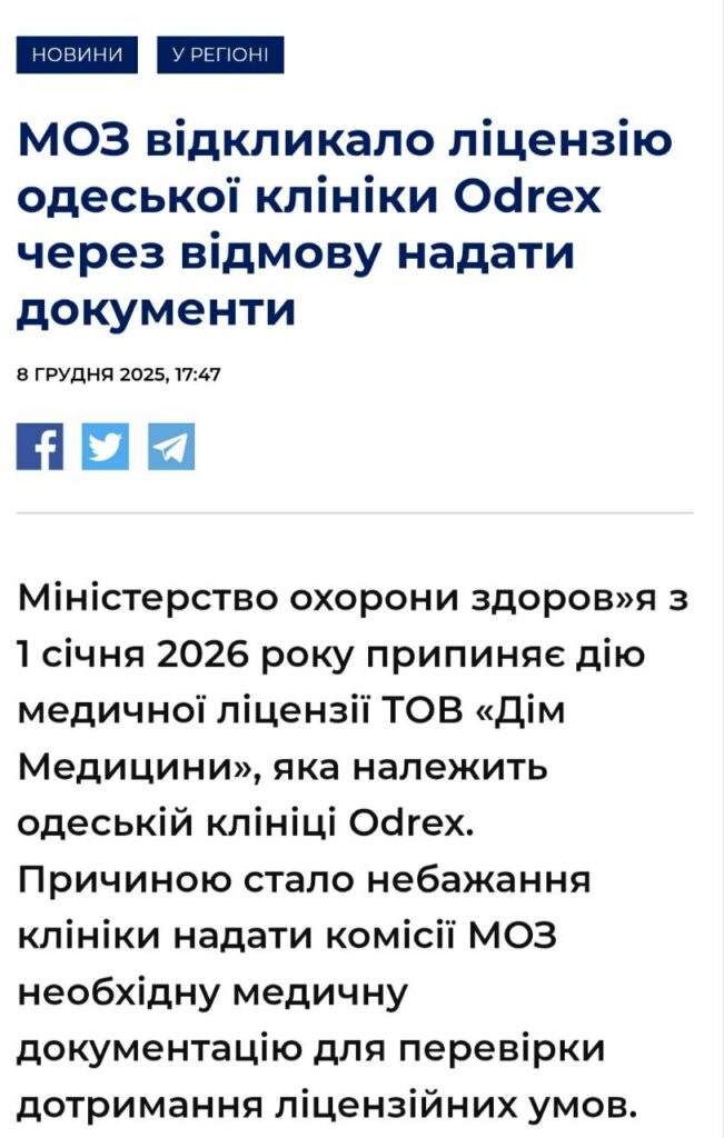 Матеріал «МОЗ відкликало ліцензію Одеської клініки Odrex через відмову надати документи» містить посиланням, за яким говориться, що ліцензія відкликана через невиконання вимог щодо надання документів під час перевірки, а це рішення набирає чинності через 30 днів. Це стало частиною ширшого скандалу, пов’язаного з розслідуванням смерті пацієнта й кримінальним провадженням за неналежну медичну допомогу. Важливо зазначити, що ліцензія була відкликана лише для певного виду діяльності, і клініка може продовжувати роботу під іншими юридичними особами чи ліцензіями. Цей контекст свідомо чи несвідомо проігнорований, що створює маніпуляцію через упущення: виглядає, ніби клініка повністю припинила свою роботу, хоча це не зовсім так