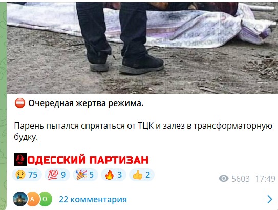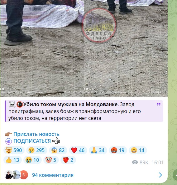 Ми з’ясували, що вперше фото з’явилось у закритому Telegram-каналі «Одесса БЕЗ ЦЕНЗУРЫ», який спеціалізується на публікації шок-контенту. В оригінальному повідомленні написано, що постраждалим є безхатченко, який заліз у трансформатор і отримав смертельні опіки.