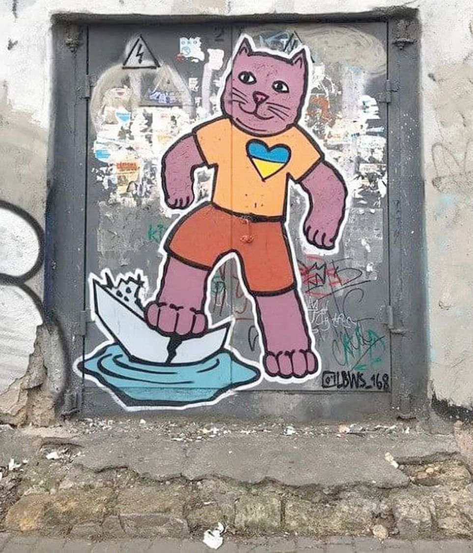 Одеський вуличний худож­ник 30-річний Ігор МАТРОС­КІН із другом Денисом БІЛИМ малюють на стінах, парканах і закинутих будівлях міста патріотичних котів. На графіті — прапори України, гасла “Слава Україні!”, “Разом переможемо”, “Доброго вечора, ми з України”, “Борщ наш”, “Вірю в ЗСУ”. Один із котів топче російський паперовий корабель. Іншого зобразили в образі головнокомандувача Збройних сил України Валерія Залужного.