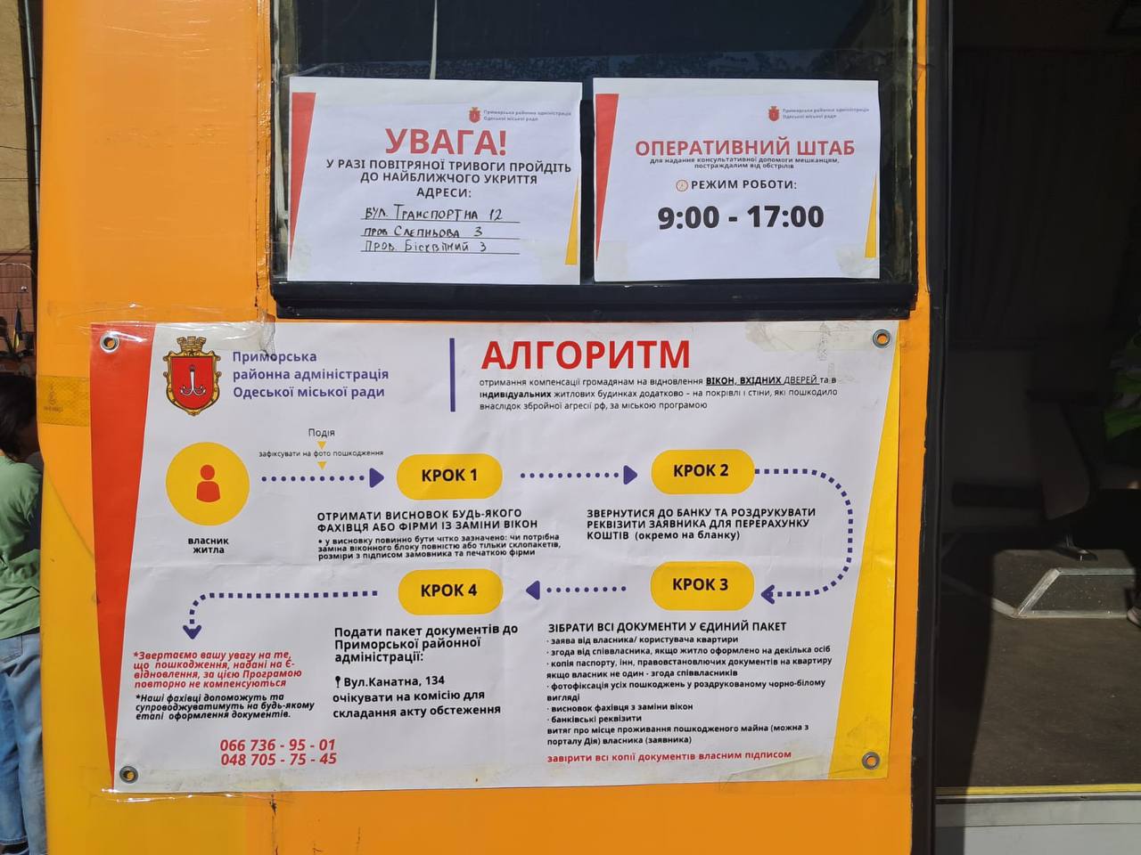 Мешканці пошкоджених будинків можуть звертатися за допомогою та консультацією до оперативних штабів або телефонувати (у робочі дні) до Приморської районної адміністрації на гарячу лінію 066-73-69-501.