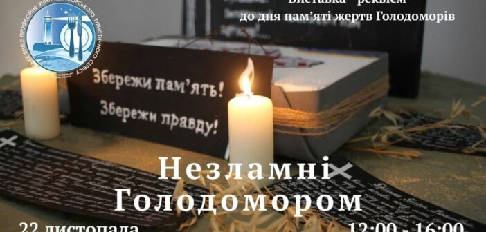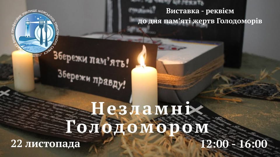 Команда Одеського вищого професійного училища морського туристичного сервісу, спираючись на дослідження Державного архіву Одеської області, продовжує просвітницький проєкт #Незламні_Голодомором і запрошує на Виставку-реквієм “Незламні Голодомором”, яка проходитиме в стінах нашого навчального закладу.