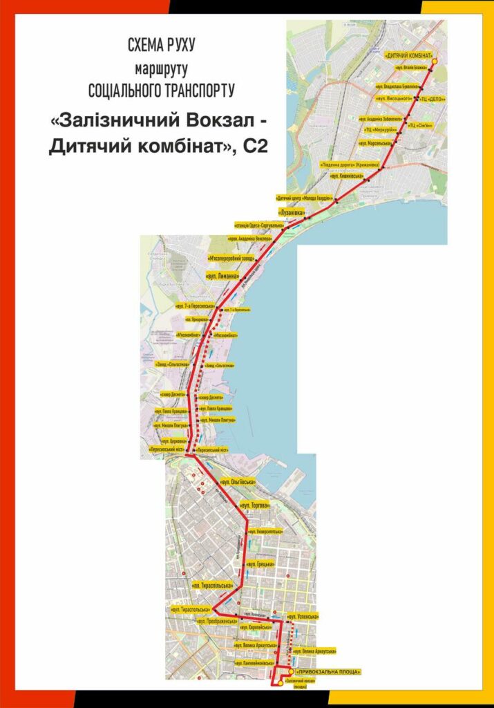 З 01 квітня 2026 року в Одесі впроваджено новий напрямок роботи соціального (безкоштовного) автобусного маршруту в тестовому режимі: С2, «Залізничний вокзал – Дитячий комбінат (вул. Семена Палія)».