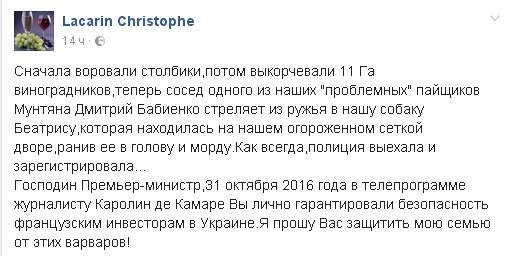 Неизвестные обстреляли усадьбу французского винодела Кристофа Лакарена и ранили собаку владельца по кличке Беатрис.