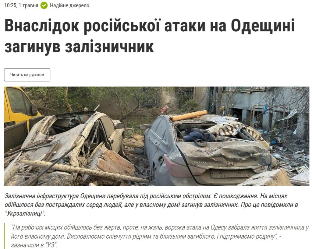 Сайт “УСІ” концентрує увагу винятково на ударах по Одесі та області. У день атаки 1 травня на сайті опубліковали щонайменше сім новин, починаючи з короткої замітки в 00:58 з посиланням на Одеську ОВА через пів години після завершення повітряної тривоги. У ній згадується про пошкодження житлових будинків та пожежі. Протягом дня медійники оновлювали інформацію про кількість загиблих, поранених, руйнування інфраструктури тощо.