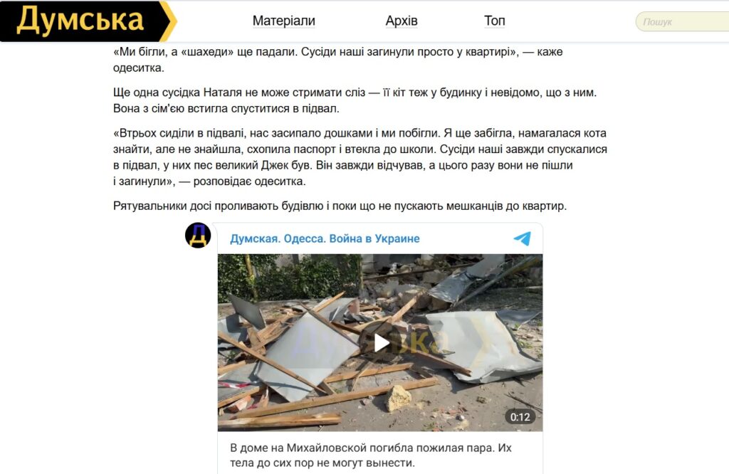 Упродовж 1 травня і в інші дні атак “Думська” регулярно оновлювала інформацію, додаючи власні або офіційні фото, відео. Разом з тим, журналісти особисто шукал і публікувал свідчення очевидців. В таких текстах вони надають місце емоційним свідченням постраждалих — цитати одеситів, які пережили жах.