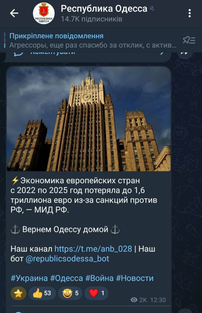 Проросійський телеграм-канал “Республика Одесса” опублікував інформацію, посилаючись на дані російського МЗС, про нібито втрати європейської економіки у розмірі до 1,6 трильйона євро за період з 2022 по 2025 роки. Причиною таких втрат називаються санкції проти Росії, проте викладені дані не мають підтвердження з незалежних джерел. Вказана цифра присутня лише в заявах російського зовнішньополітичного відомства та поширюється медіа без аналізу методології чи надання вихідних даних. У відкритих документах Єврокомісії, Організації економічного співробітництва та розвитку, а також міжнародних аналітичних центрів оцінки, які відповідали б цій заяві, відсутні.