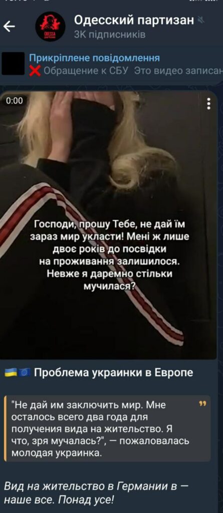 Проросійські джерела продовжили активно поширювати фейки. Так телеграм-канал «Одесский партизан» поширив відео з дівчиною, яка плаче через те, що боїться заключення мирних переговорів. Адже тоді вона не зможе залишатись далі в Євросоюзі, хоча їй до посвідки на проживання залишилось два роки. Проте насправді текст, поширений у відео, не відповідає дійсності