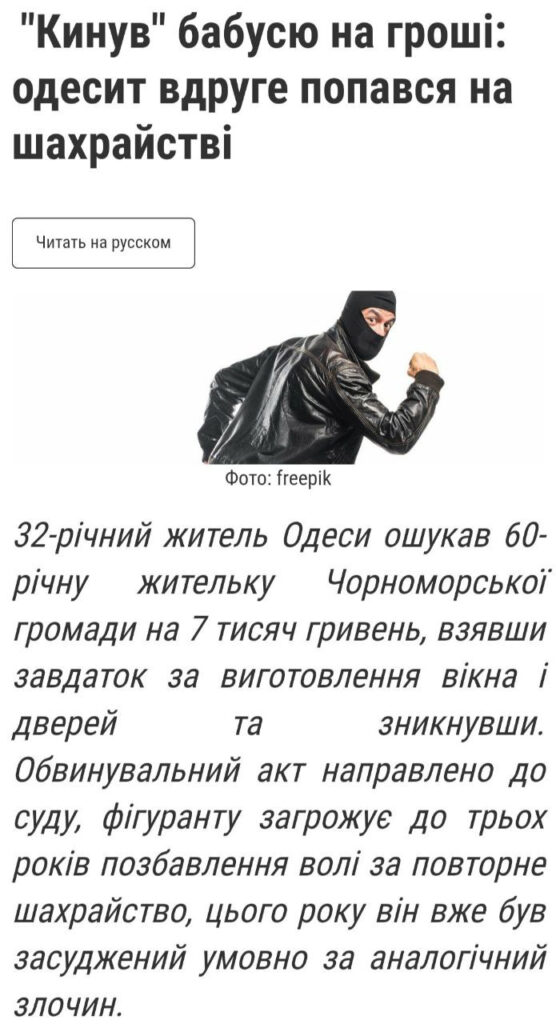 Матеріал «Кинув бабусю на гроші: одесит вдруге попався на шахрайстві» є кримінальною новиною з моральним ярликуванням без показу всіх процесуальних деталей. Якщо в тексті відсутні посилання на поліцію чи судові рішення, заголовок може створювати враження остаточного вироку до надання рішення суду. Тут маніпуляція відбувається через емоційний, осудливий тон («кинув бабусю») і можливе опущення формальних деталей (кваліфікація злочину, стадія справи).