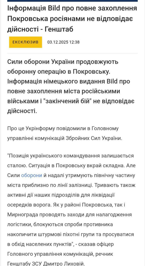 Офіцер Головного управління комунікацій та речник Генерального штабу ЗСУ Дмитро Лиховій в коментарі виданню Укрінформ повідомив, що ситуація в Покровську вкрай складна, але Сили оборони й надалі утримують північну частину міста приблизно по лінії залізниці. Також продовжуються активні дії наших підрозділів для ліквідації осередків ворога. Як у районі Покровська, так і Мирнограда проводяться заходи для налагодження логістики, блокуються спроби противника накопичити штурмові піхотні групи та просуватися в обхід населених пунктів.