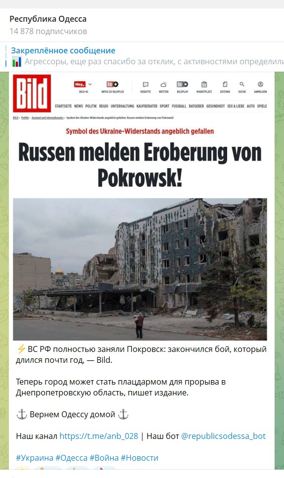 Проросійський телеграм-канал «Республика Одесса», відомий своїми фейками та вкидами, опублікував інформацію про повне захоплення міста Покровськ на Донеччині. Особливістю цього фейку було те, що воно на німецьке видання Bild. Однак станом на сьогодні, Сили оборони України продовжують оборонну операцію в Покровську. Інформація німецького видання Bild про повне захоплення міста російськими військами і «закінчений бій» не відповідає дійсності.