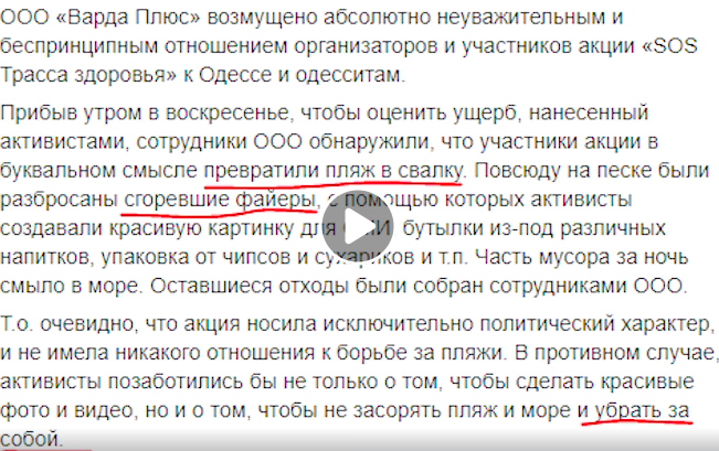 Станислав обнаружил, что компания-застройщик распространяет рекламу в Facebook, в которой демонстрируется, что пришедшие акцию одесситы намусорили на пляже, где проводилась акция.