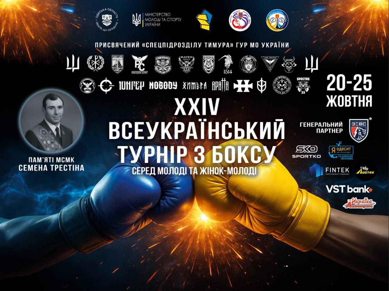 25 жовтня в Одесі відбудеться завершальний день XXIV Всеукраїнського турніру з боксу серед молоді та жінок-молоді, присвяченого героїчному «спецпідрозділу Тимура» ГУР МО України та пам’яті майстра спорту міжнародного класу Семена Трестіна. Початок фінальних боїв о 12:00