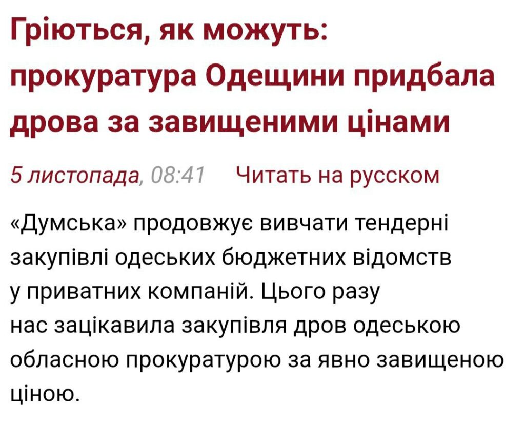 Повідомлення «Гріються, як можуть: прокуратура Одещини придбала дрова за завищеними цінами» про закупівлю 334 кубометрів дров за ціною вищою за ринкову має розслідувальний відтінок. Тут журналістика працює як контроль: порівняння цін, питання щодо тендеру і можливого завищення. Маніпуляційна загроза поляговає у вибірковості даних. Не зовсім зрозуміло, які саме ринкові пропозиції порівнюють, і вживаються емоційні слова на кшталт «золоті дрова» для викликання обурення в читача.