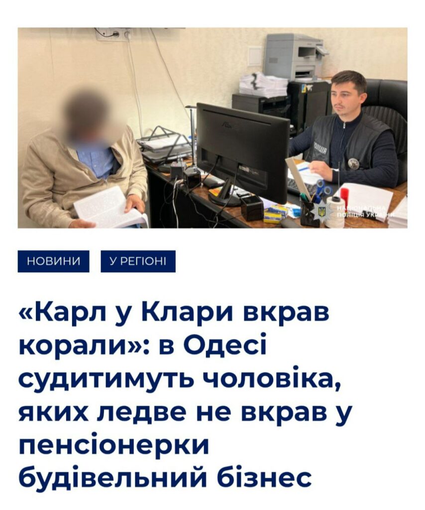 Новина «”Карл у Клари вкрав корали»: в Одесі судитимуть чоловіка, яких ледве не вкрав у пенсіонерки будівельний бізнес» подана з іронічним заголовком, що привертає увагу, але інформативно розповідає про механіку шахрайства (фальшива довіреність, спроба заволодіти корпоративними правами). Тут помітне поєднання веселого заголовку  та серйозного тексту. Заголовок працює як кліковий тригер, але за суттю цей матеріал є  звичайним кримінальне повідомленням із посиланням на поліцію. Сатиричні чи книжкові фрази в заголовку можуть зменшувати сприйняття серйозності події або навпаки, підсилювати інтерес за рахунок спрощення.